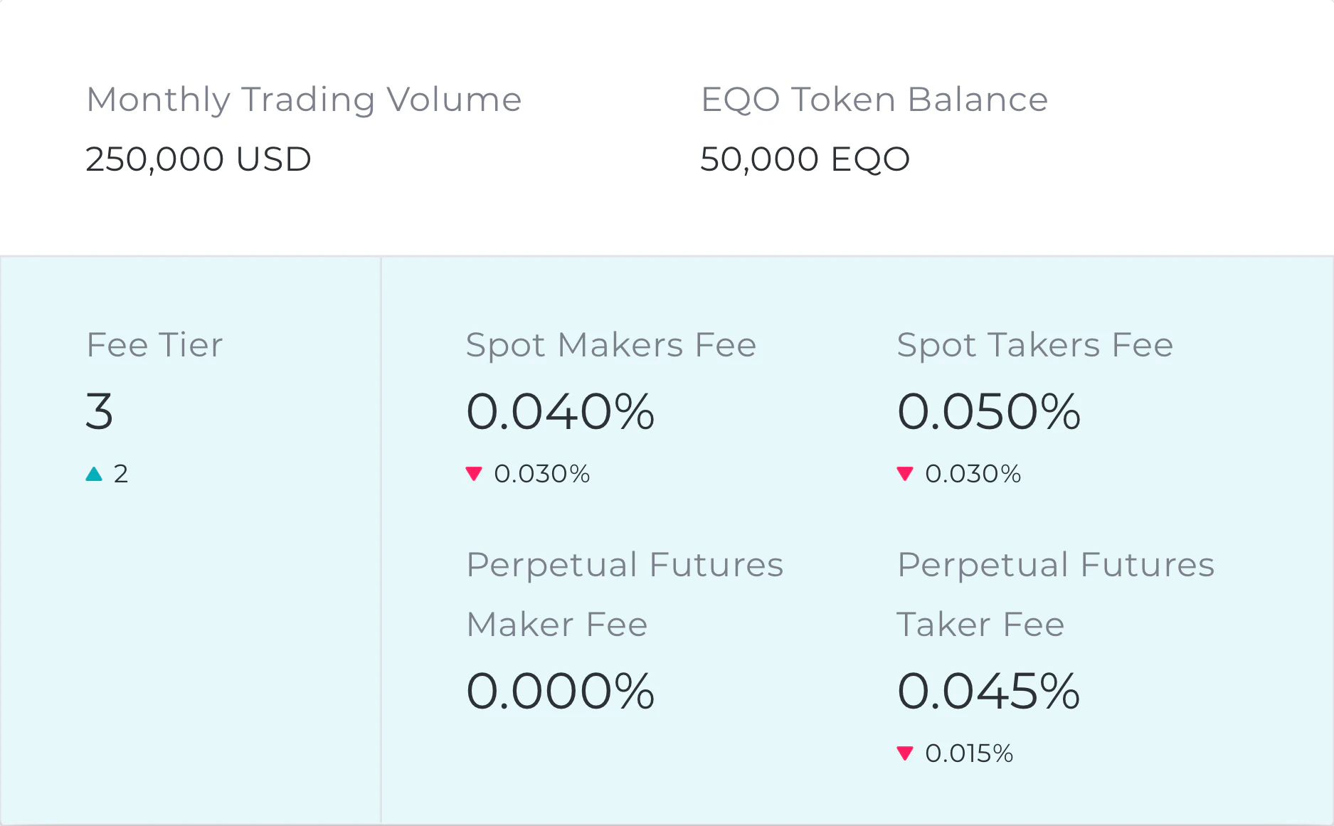 Holding EQO tokens on EQUOS entitles clients to discounted trading fees based on their token balance. Depending on the amount, clients will receive a fee tier upgrade.