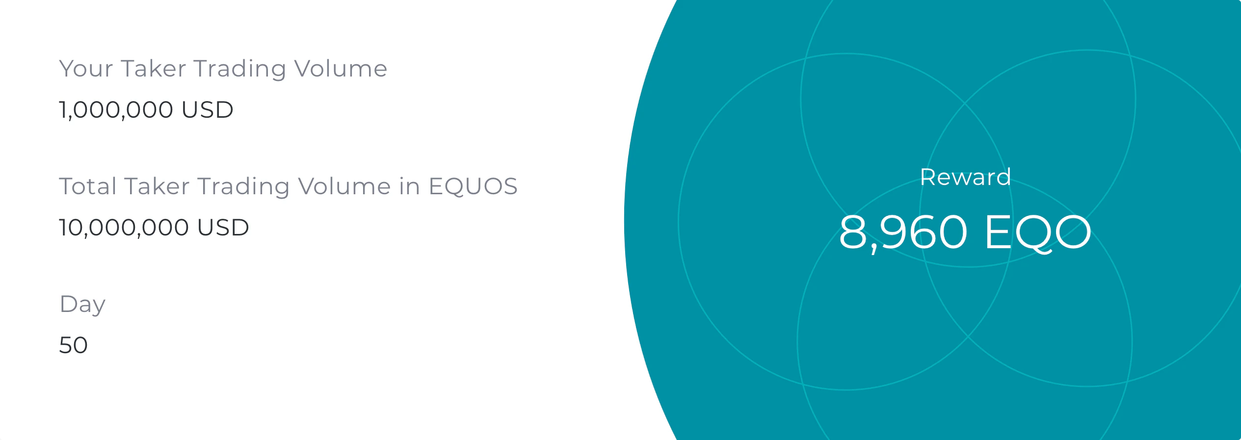 Earn EQO token with your taker trades. Every day receive a percentage of the daily token allocation, based on your share of all taker volume that day.